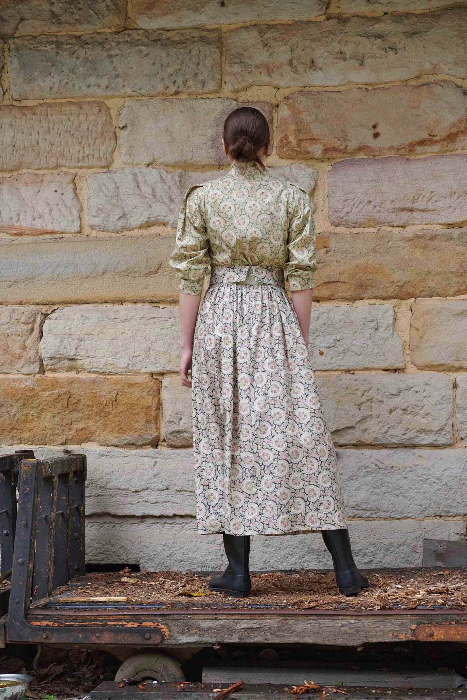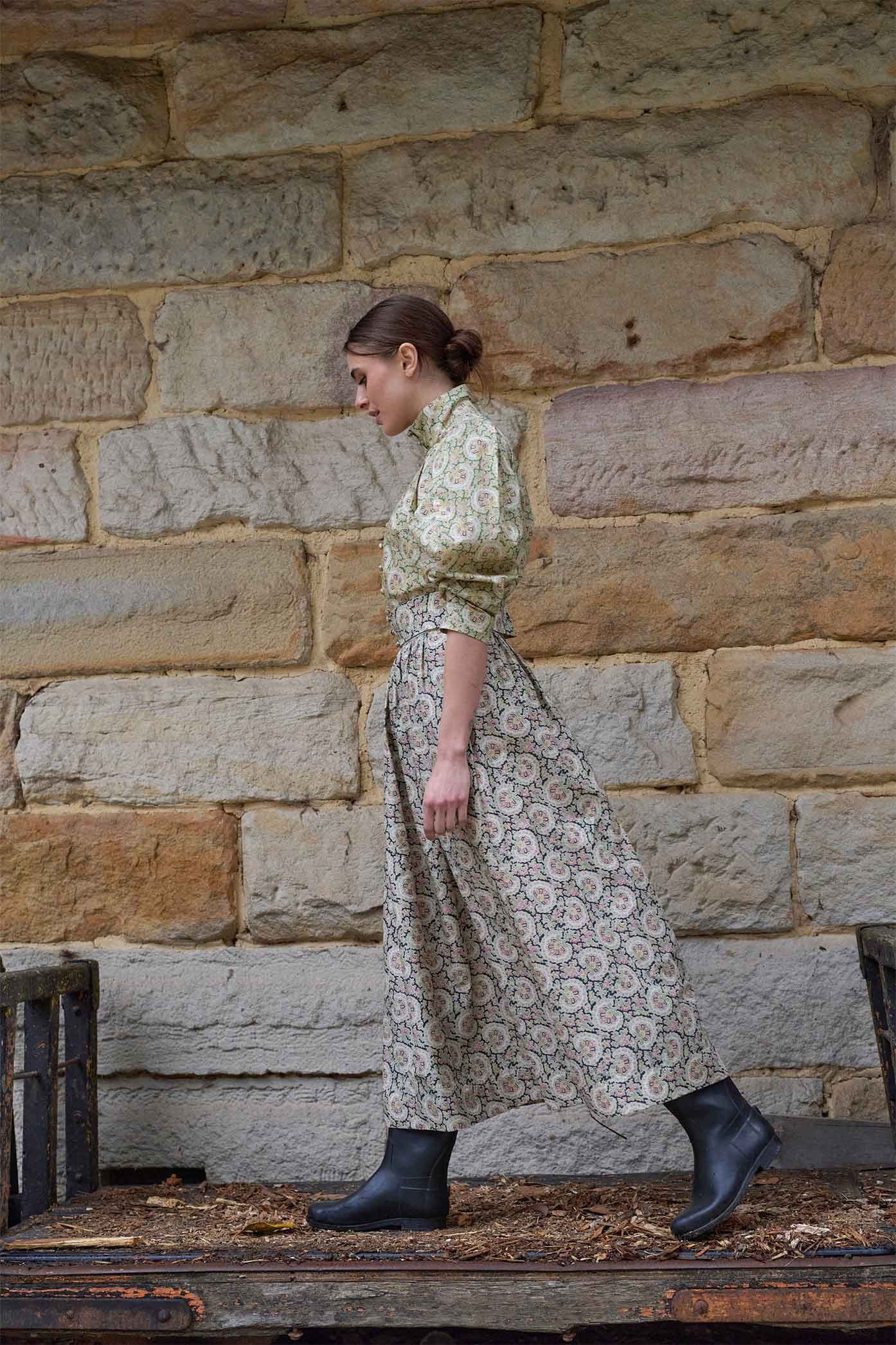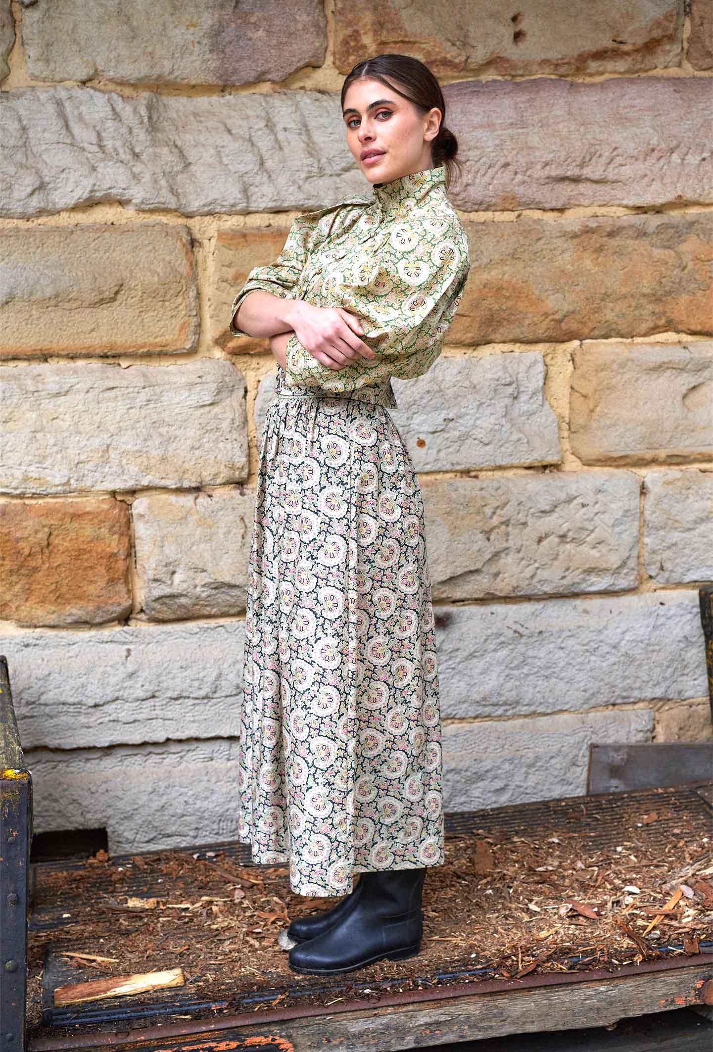 The Paisley Annushka Blouse features a high neck stand collar, fabric covered shank buttons and rouleau loop closure and a Victorian style pleat ‘leg of mutton’ sleeve.
