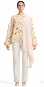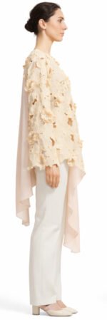 An elegant floral lace blouse with three-dimensional appliqué and an asymmetric chiffon drape, designed to flow effortlessly with refined, modern sophistication.