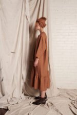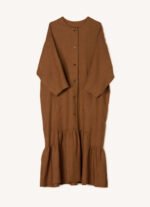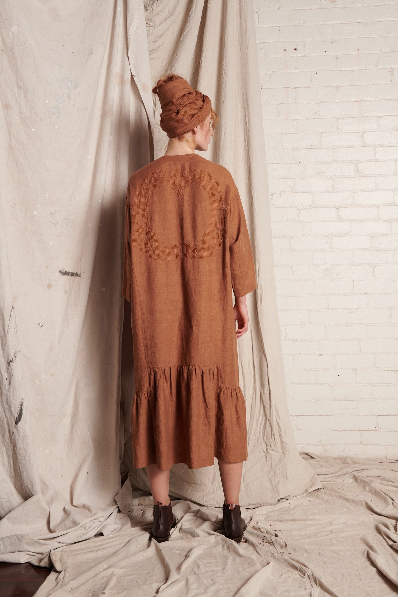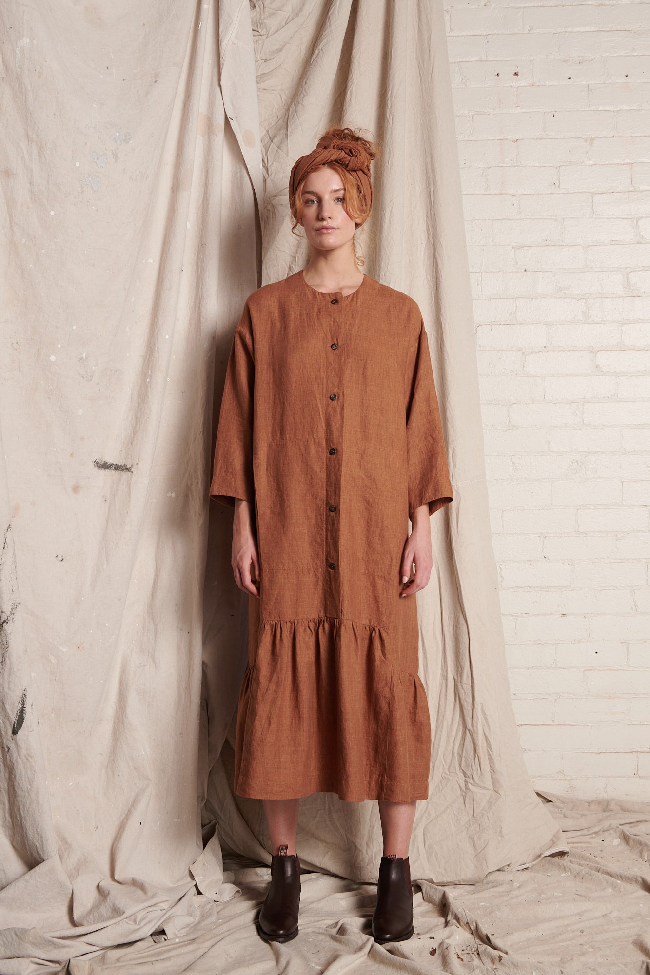 It has a round neckline, centre front buttondown closure, generous long sleeves and flounced hem. This dress can be layered under for the cooler months and worn as is for warmer weather. It is made from a pure washed linen that is woven especially for us in India and is available in both the bronze cross dye and blue cross dye colourways. This garment is designed and sampled in our Haberfield Studio in Sydney and handmade in New Delhi, India.