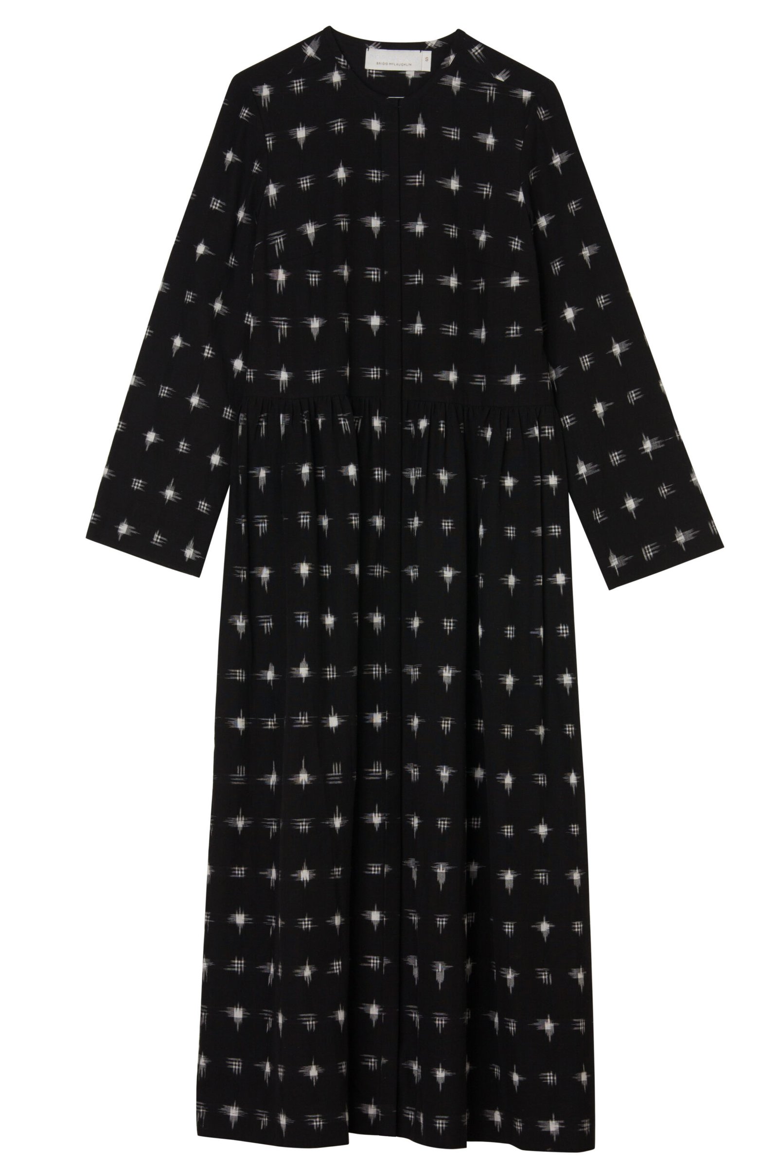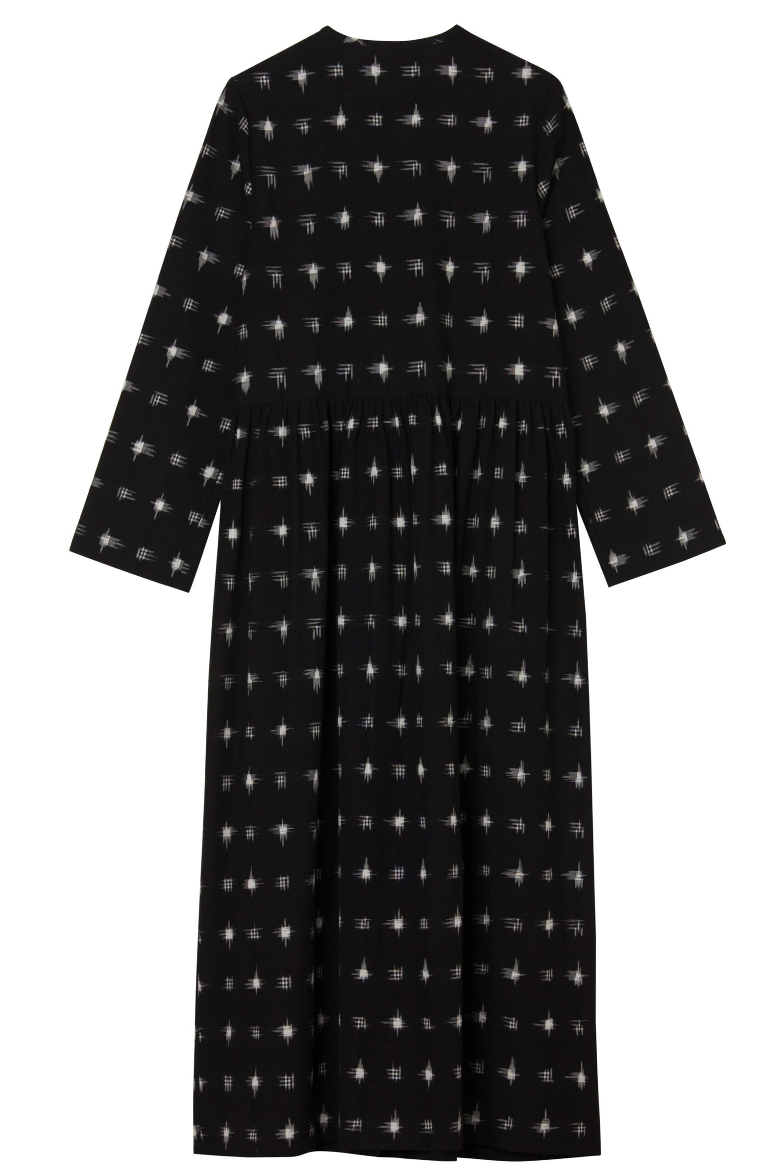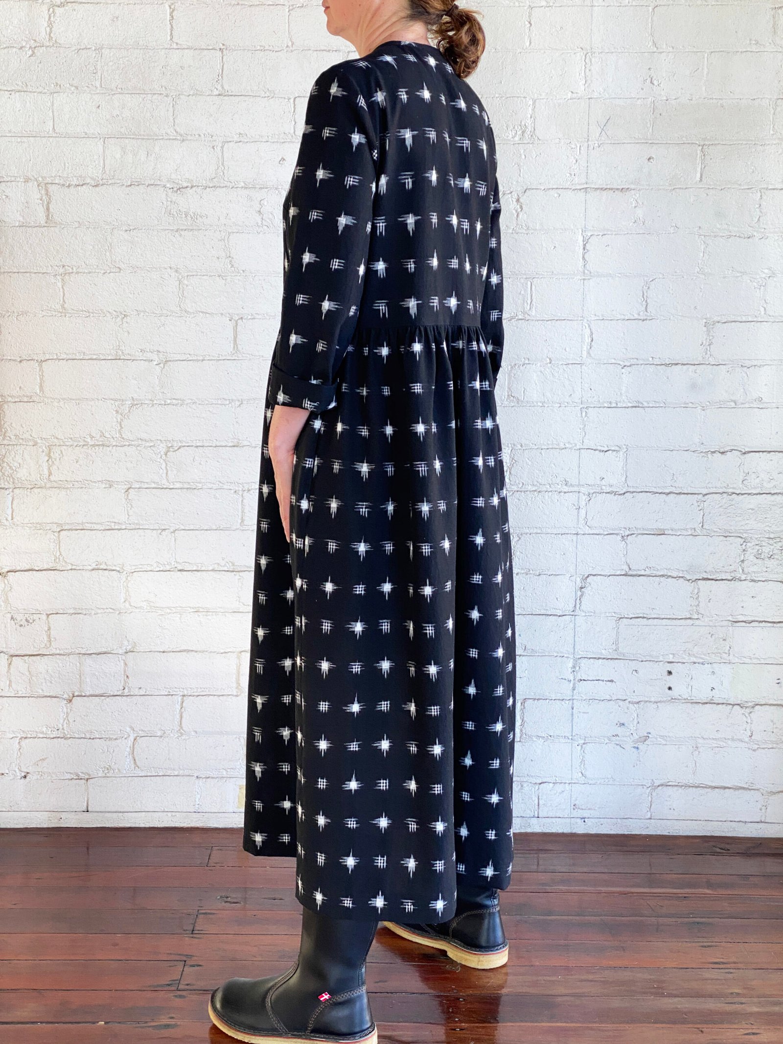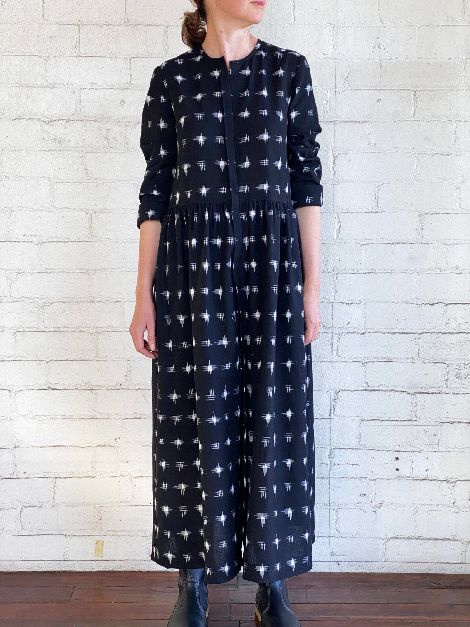 The Idha Dress is all about the beauty of the artisanal cotton textile. The fabric is a true Double Ikat; it has a black base with Ivory Cross Motifs woven within the fabric by skilled artisans. The effect from a distance is almost like “twinkling stars”.