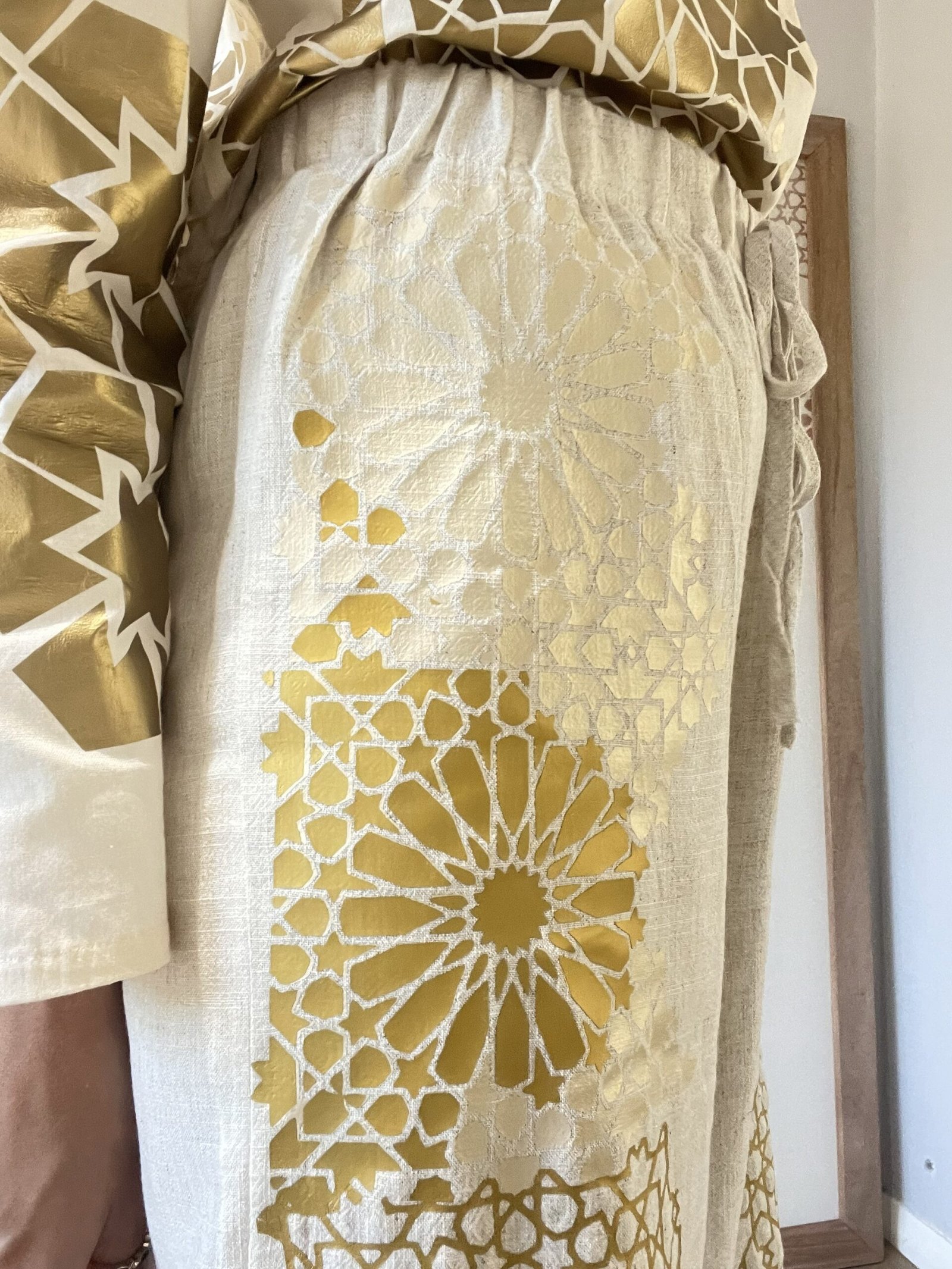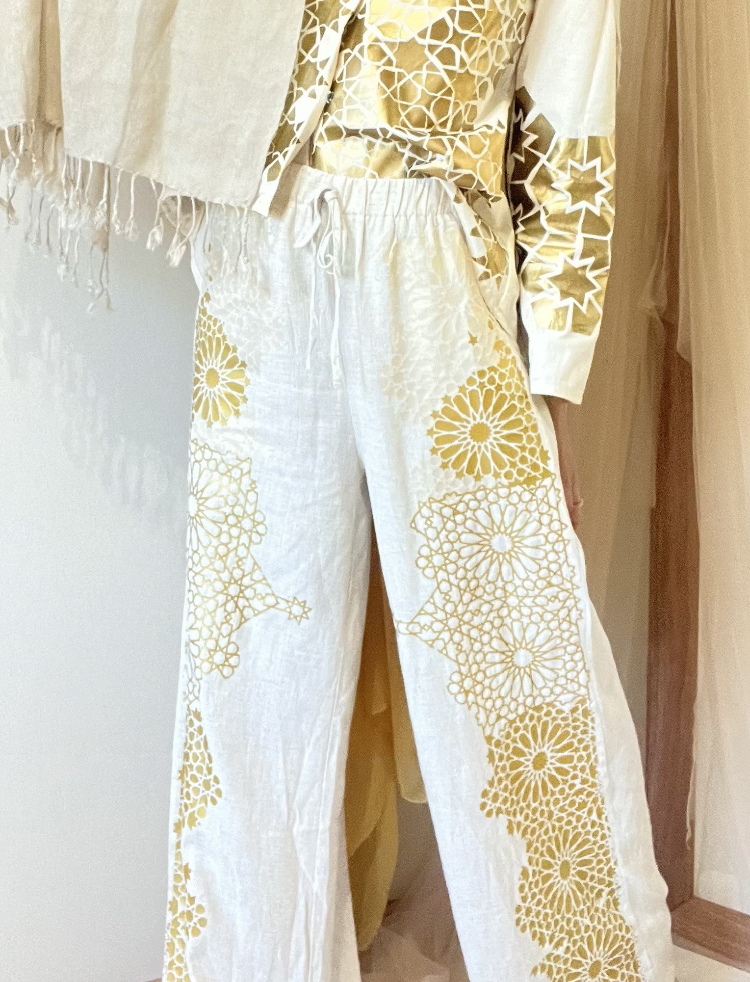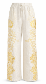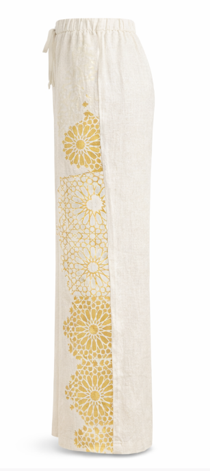 Linen trousers finished with a hand-applied gold print.