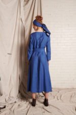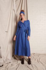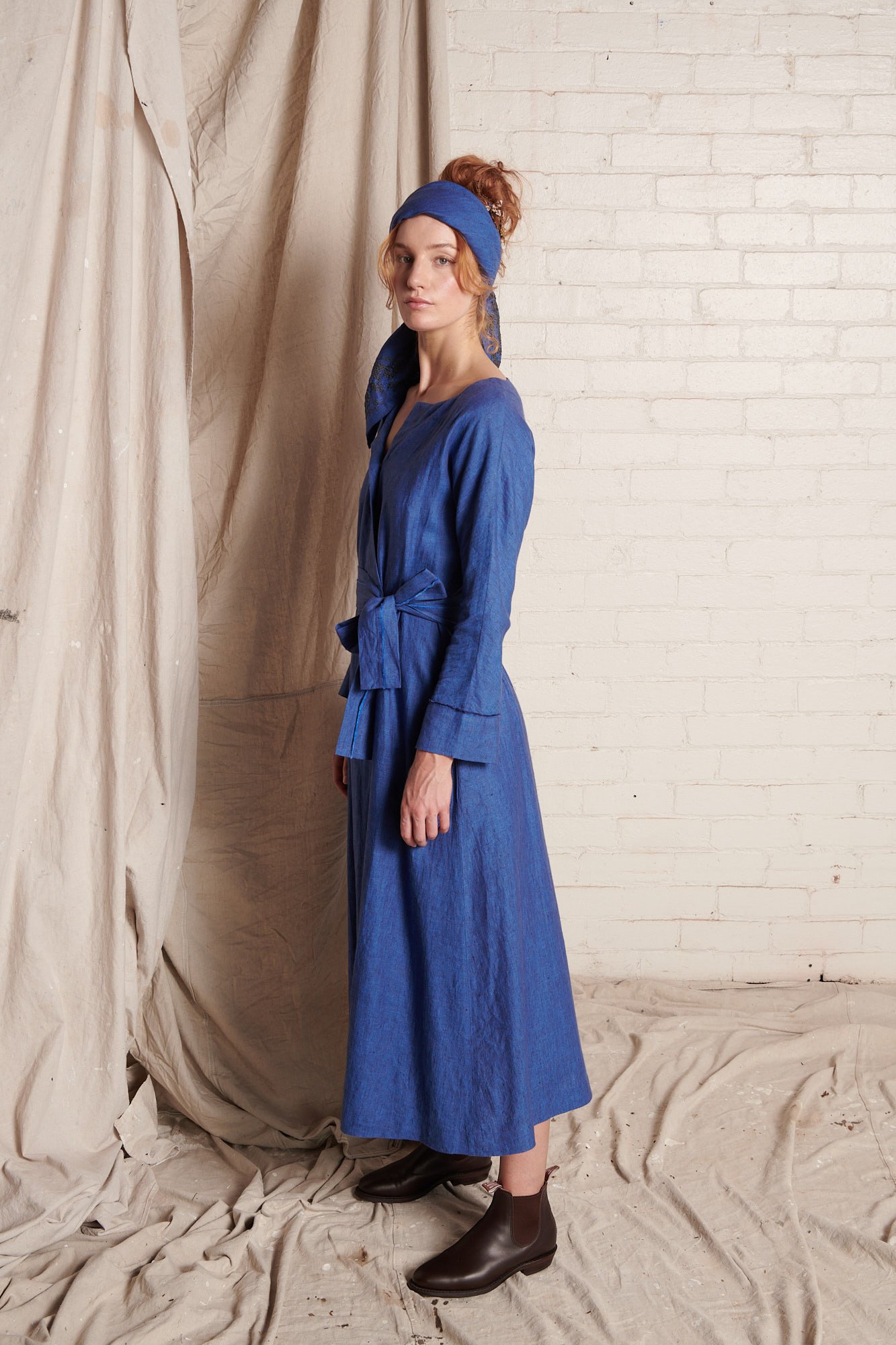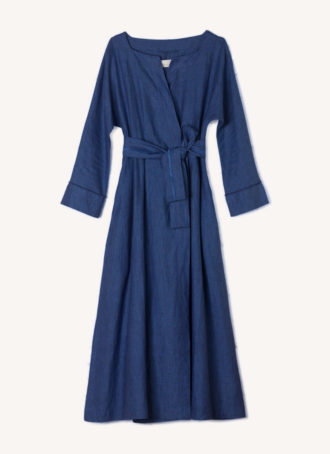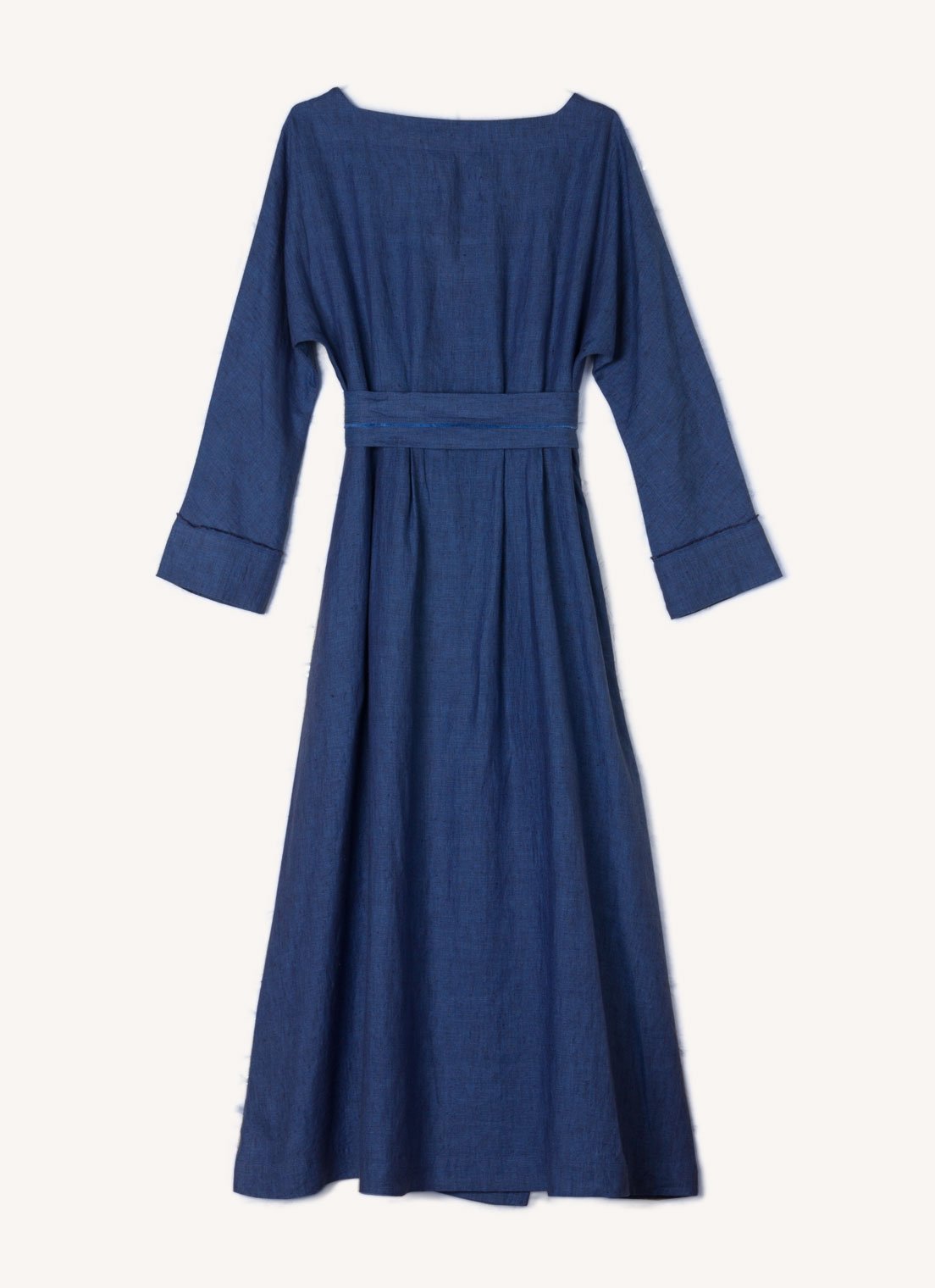 This dress has an open, square-cut neckline and long, cuffed sleeves with hand frayed edge finish. It is secured with carefully engineered fastenings on the inside of the dress to hold it in place when sitting. It also has side seam pockets and hidden press studs below the neckline. The Margot Dress is available in Bronze Cross Dye and Blue Cross Dye colourways and comes with a matching washed linen belt with hand frayed detailing that is tied at the torso. The linen fabric used for this dress is woven especially for us in India. This garment is designed and sampled in our Haberfield Studio in Sydney and handmade in New Delhi, India.