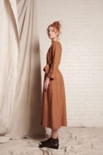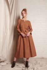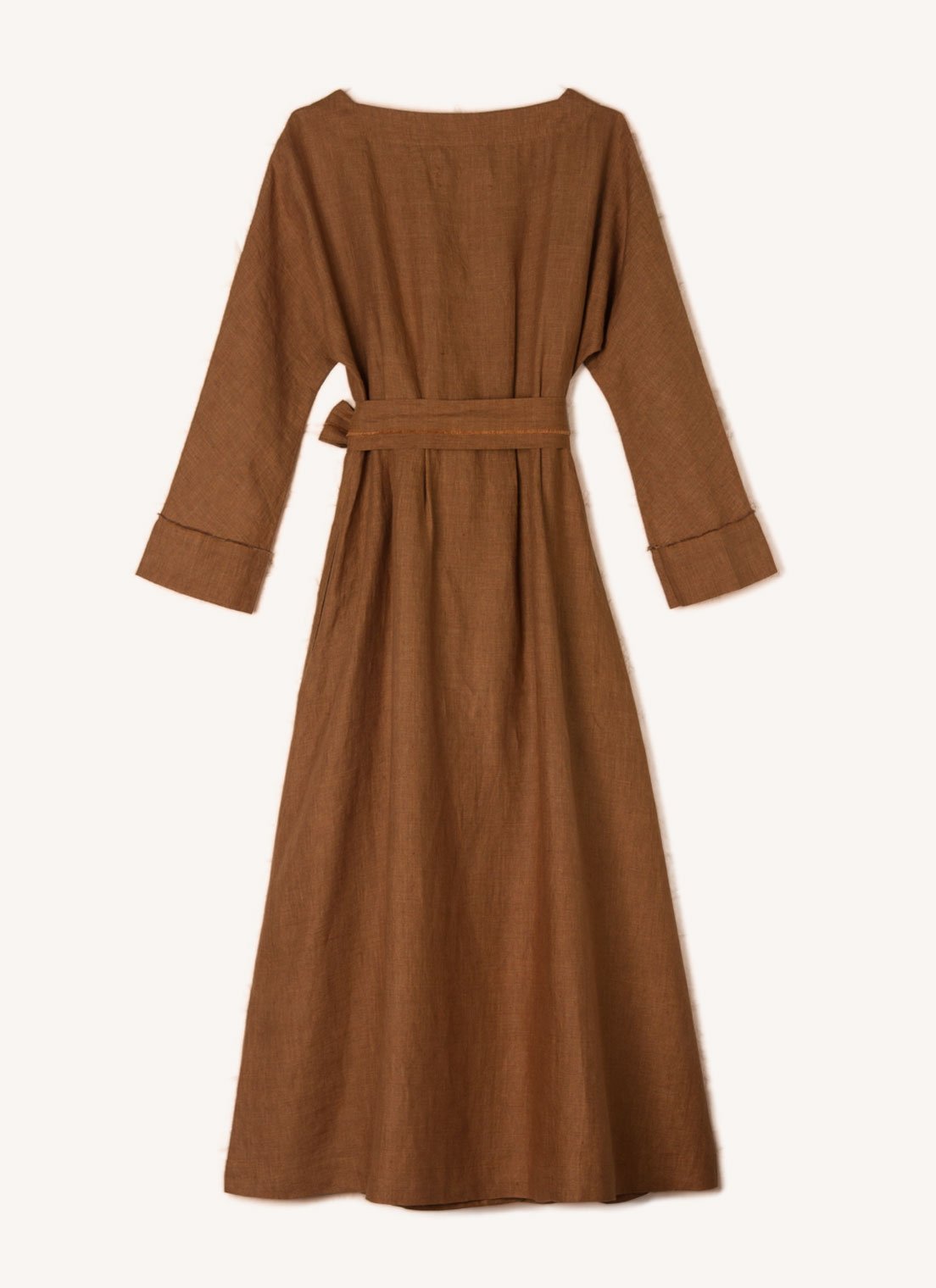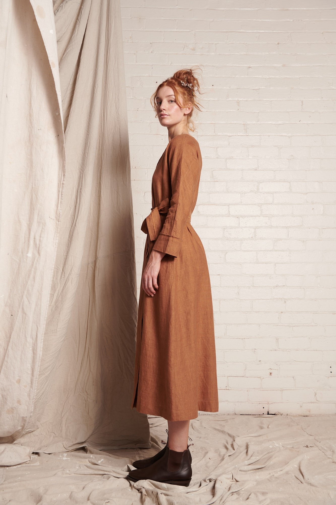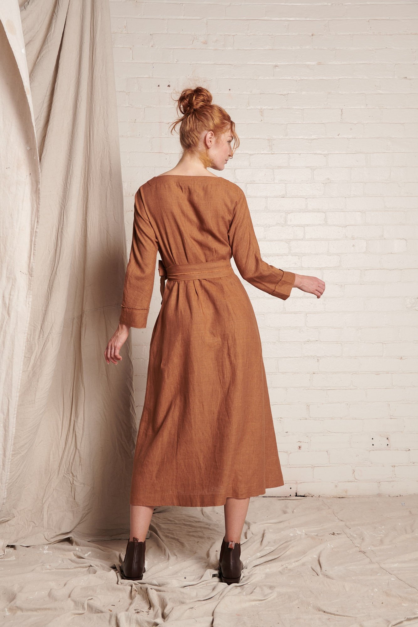 This dress has an open, square-cut neckline and long, cuffed sleeves with hand frayed edge finish. It is secured with carefully engineered fastenings on the inside of the dress to hold it in place when sitting. It also has side seam pockets and hidden press studs below the neckline. The Margot Dress is available in Bronze Cross Dye and Blue Cross Dye colourways and comes with a matching washed linen belt with hand frayed detailing that is tied at the torso. The linen fabric used for this dress is woven especially for us in India. This garment is designed and sampled in our Haberfield Studio in Sydney and handmade in New Delhi, India.