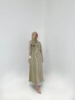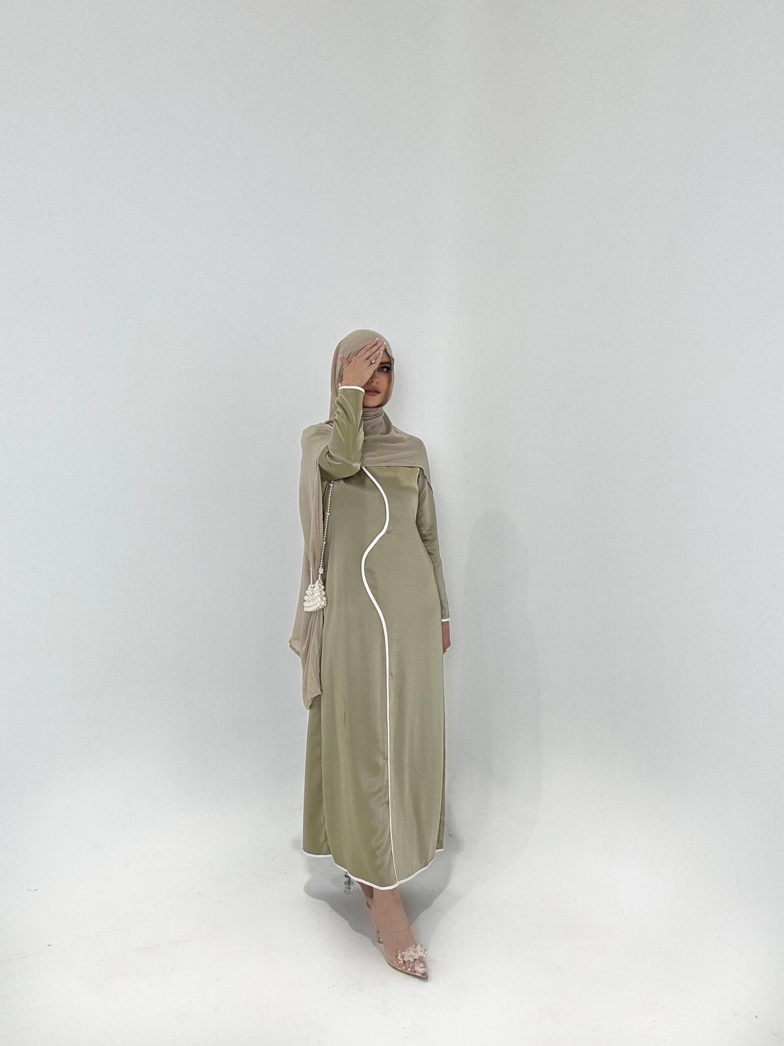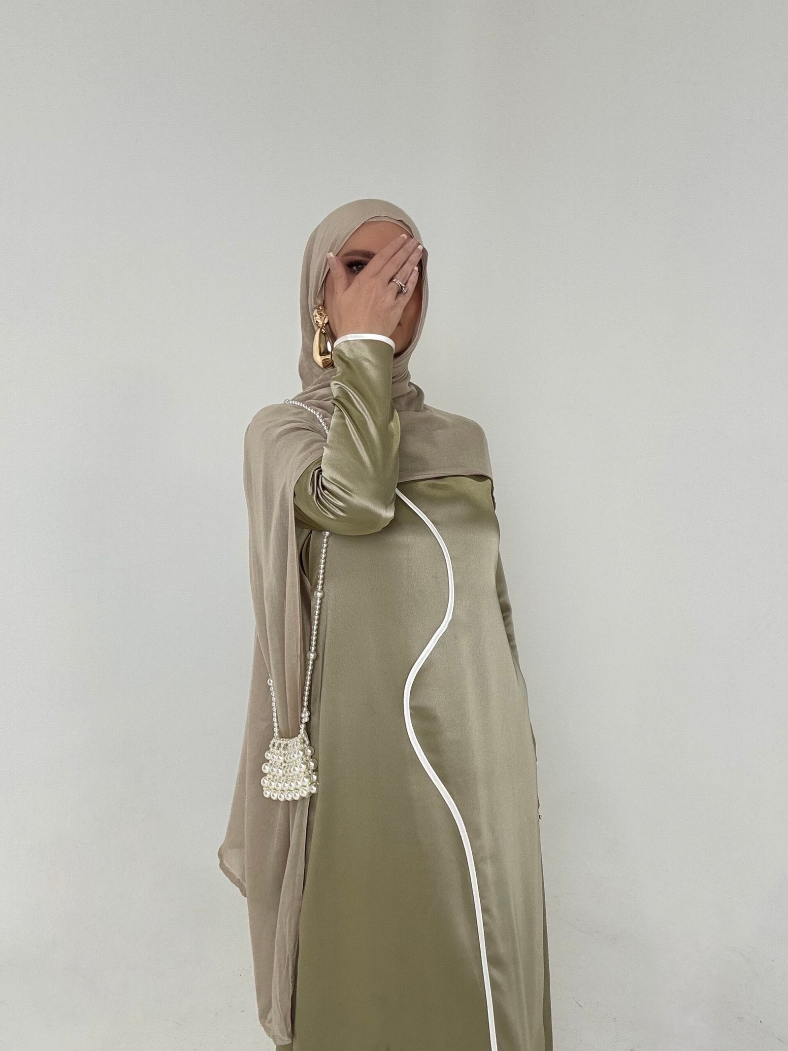 Radiate elegance in the ‘Noor’ Dress – by Pious The Label, crafted from luxurious satin in a soft olive green with delicate white detailing that adds a touch of sophistication. With its flowing silhouette and adjustable side ties for a modest, custom fit, this graceful piece is perfect for weddings, evening events, and special occasions.