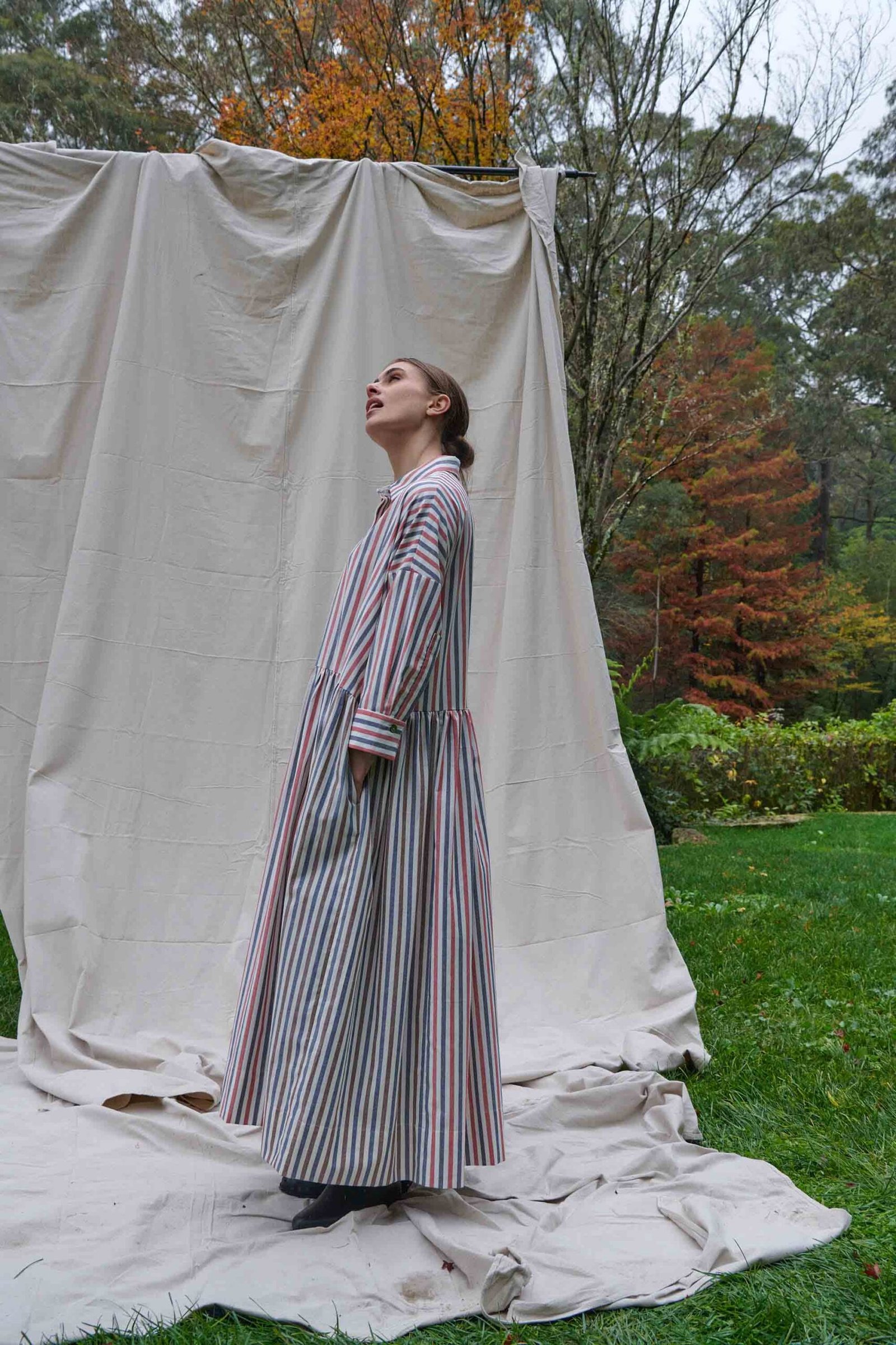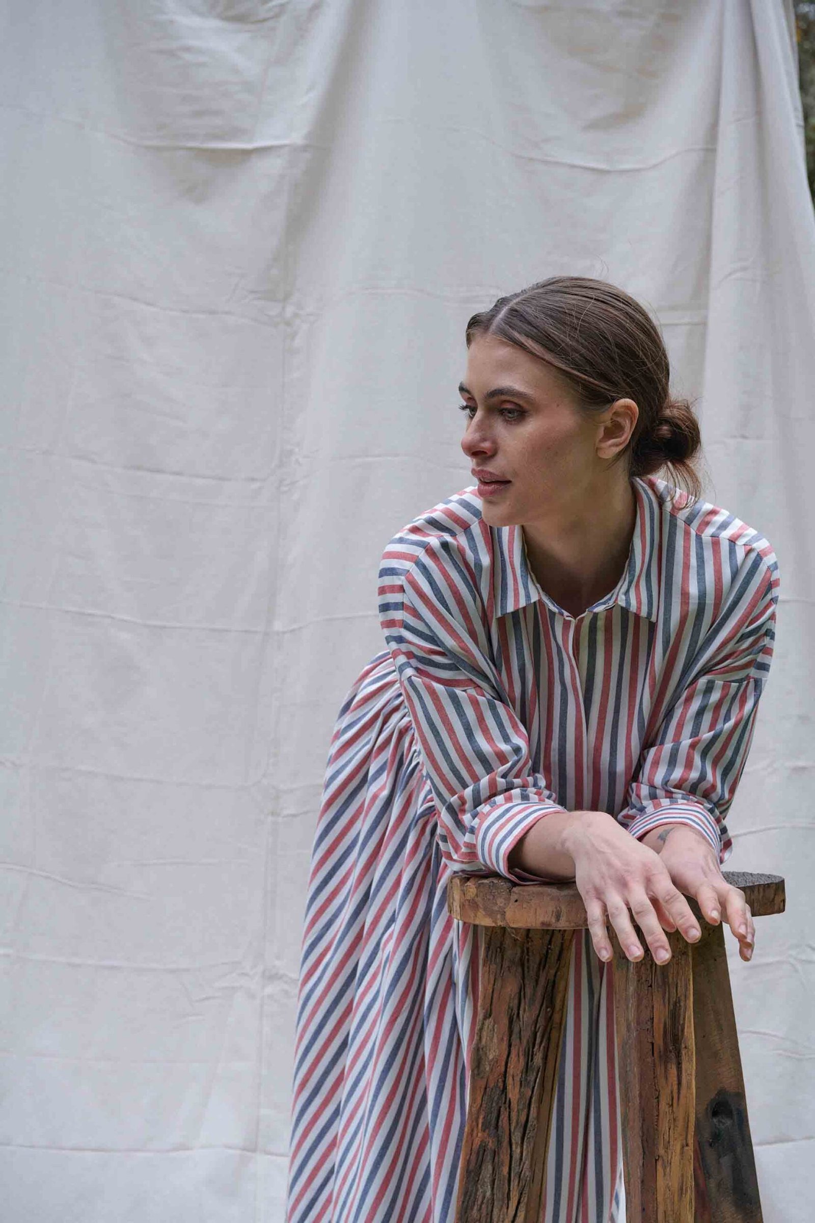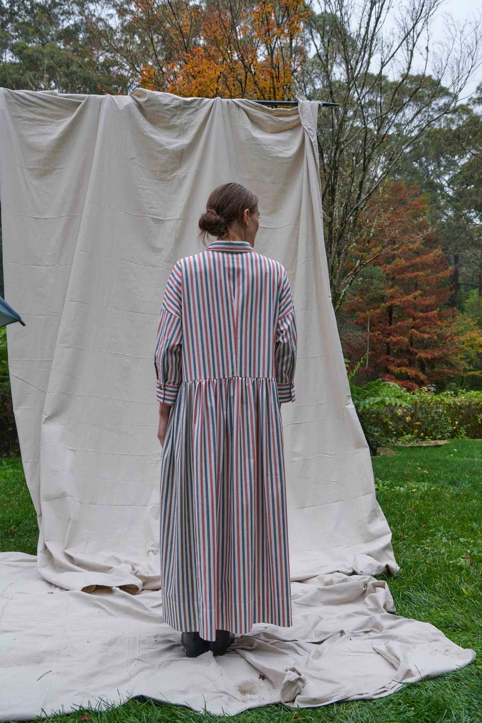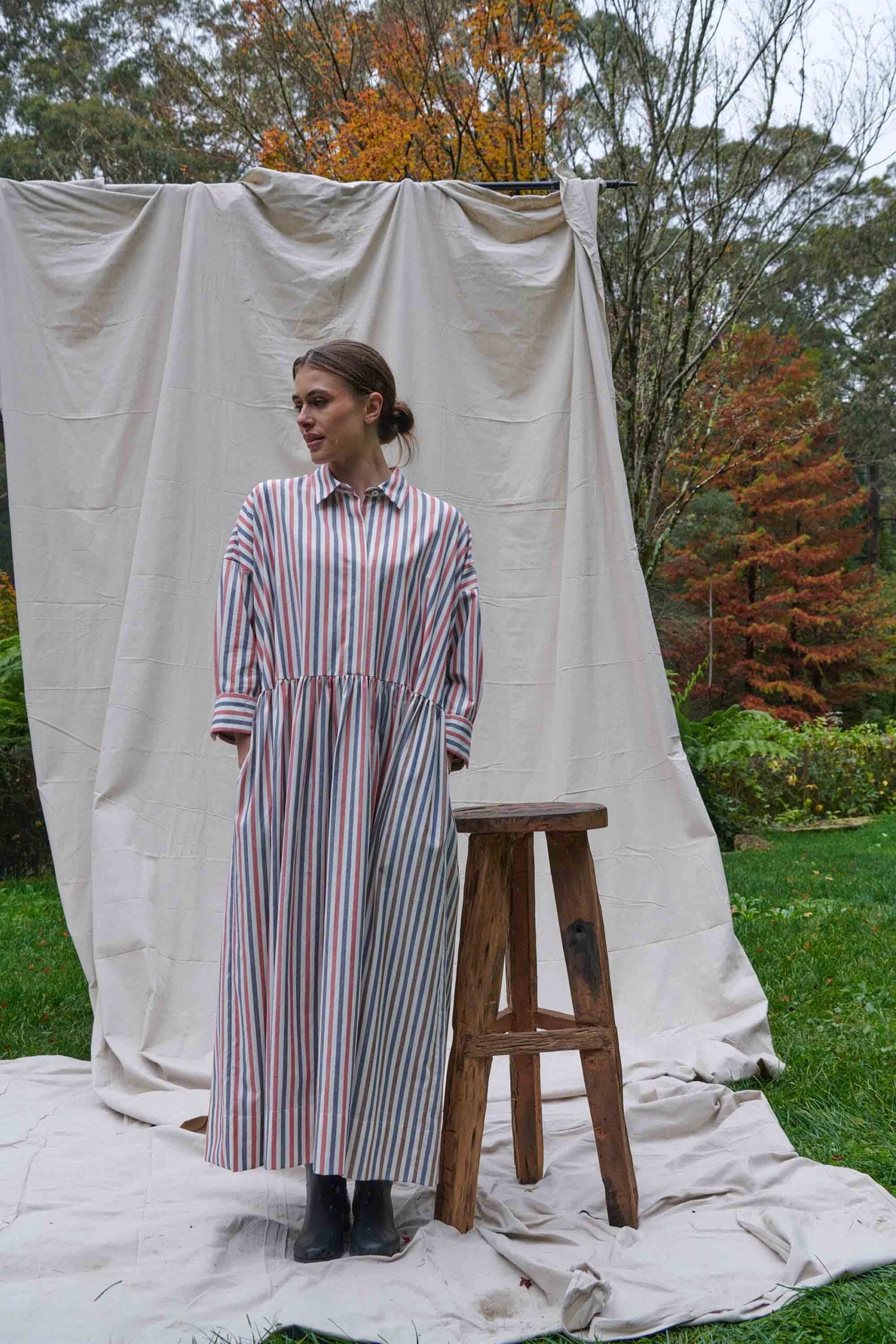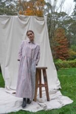 The main of the dress is composed of a red and navy stripe on an ivory ground. Subtle interest is added by the addition of an unexpected panel in navy and brown stripe at the side front of the skirt. The dress features a classic collar, a chesterfield closure on the front, a dropped shoulder line making a visually short sleeve that falls to the wrist with cuffs, and a gathered skirt section with pockets within each side seam. The Sawyer Dress is made from a mid-weight 50% Cotton and 50% Linen striped Cotton Oxford weave fabric that is a surplus stock and is made in Japan. The Sawyer Dress is designed, pattern made, sampled, and hand cut in our Haberfield studio in Sydney. It is then sewn and finished in Sydney Australia by our local maker with great care and expertise in limited numbers.