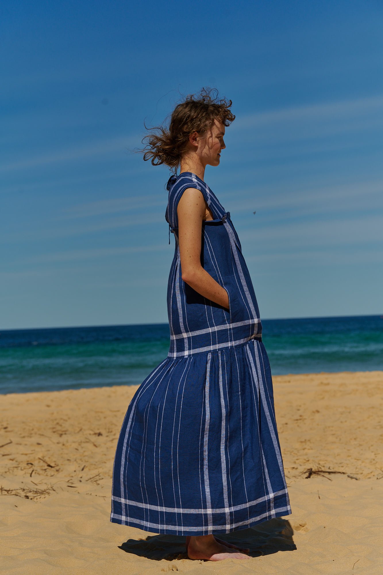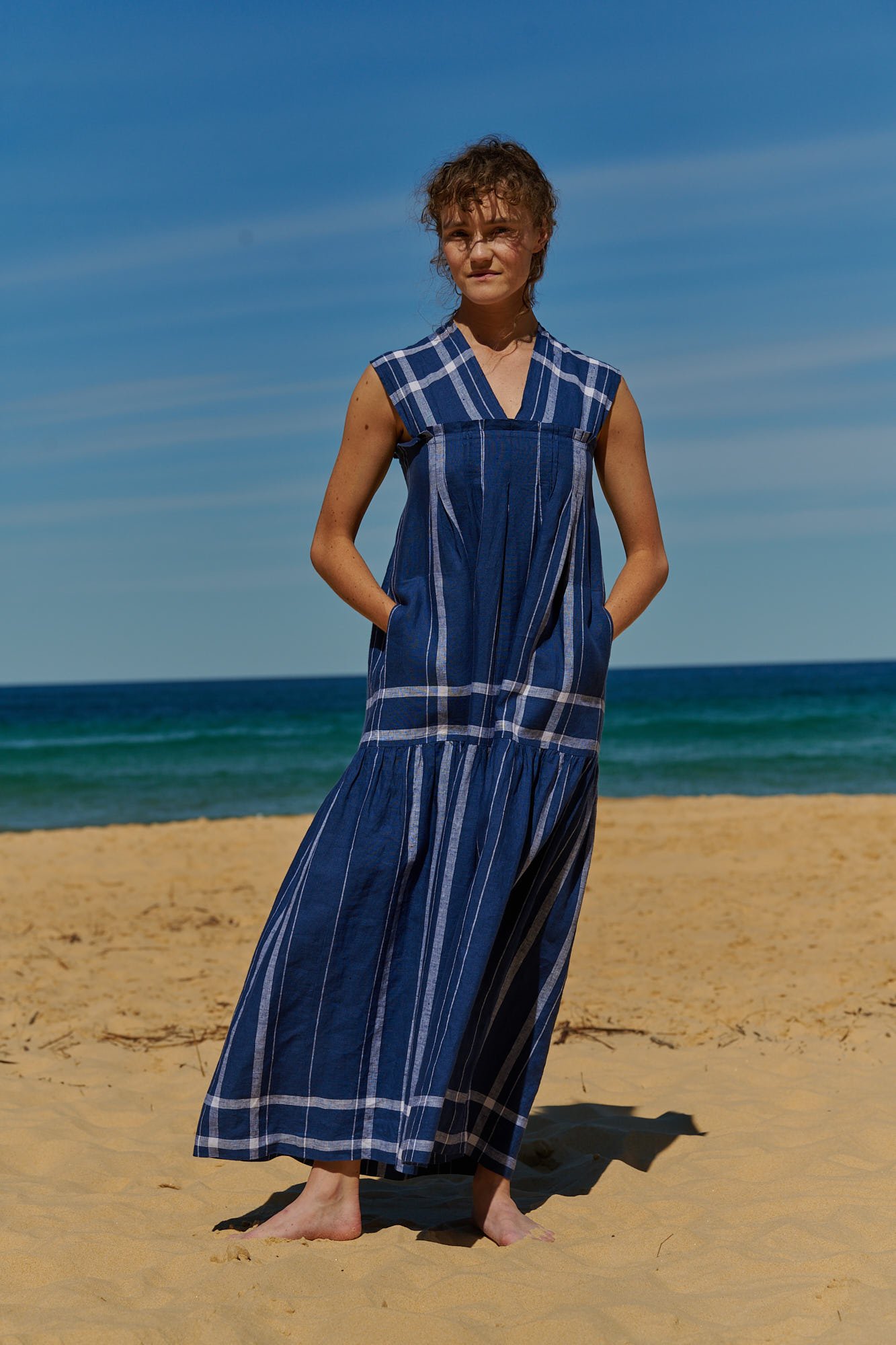 Made from European pure linen in an exclusively designed and woven double plaid, the V Maxi Dress is a tiered sleeveless dress that features subtle pleating and gathering detailing.