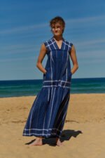 The dress has a V-neckline at the front and back and is secured at the back with a tie. It is a unique yet easy summer holiday dress and yes: it has pockets! It is available in two colourways: Indigo Plaid and White Plaid. The woven textile was designed in house and the fabric was woven exclusively for us in India. The garment was designed, pattern made and sampled in our Haberfield Studio in Sydney, Australia and then hand cut and crafted in New Delhi, India.