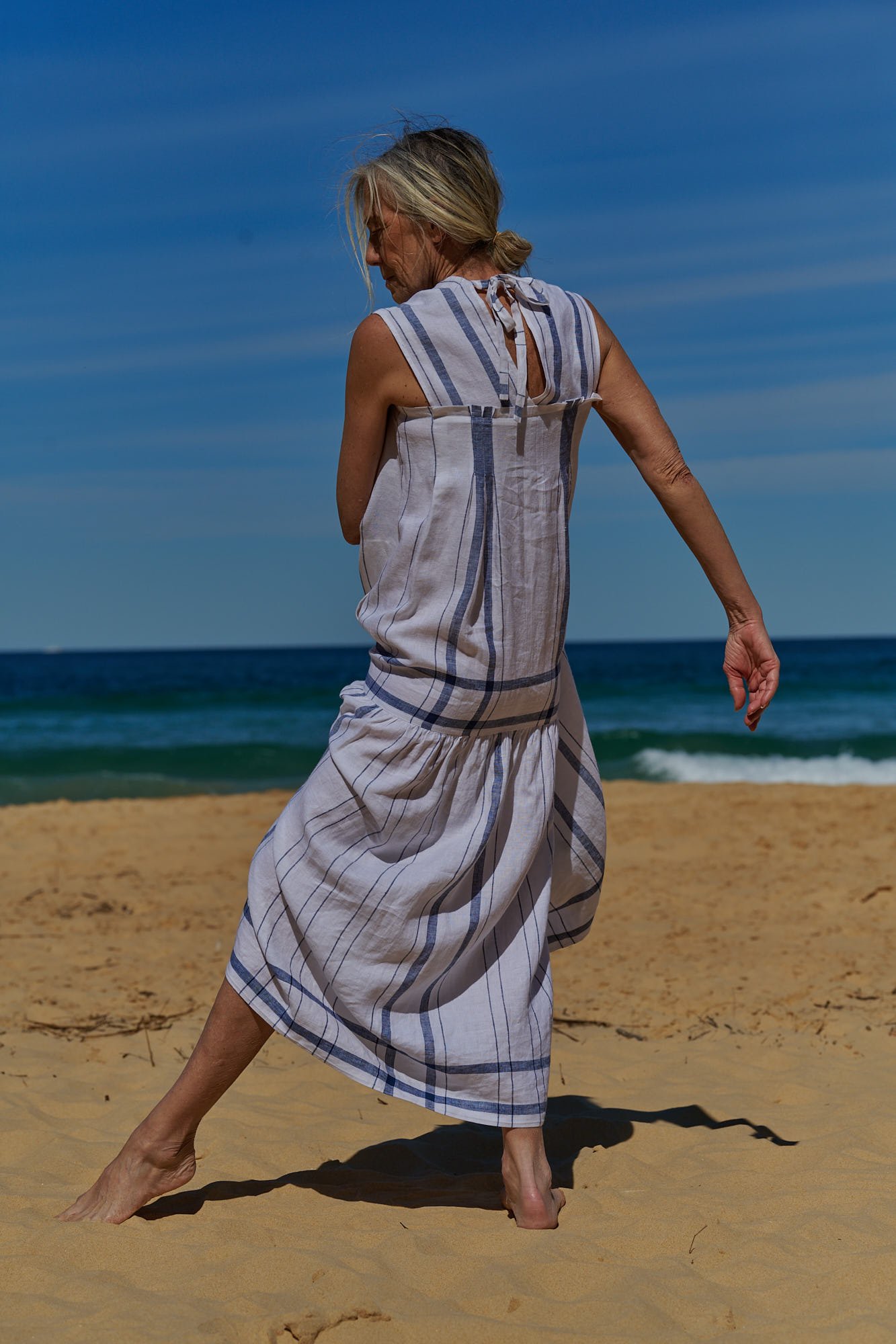 The dress has a V-neckline at the front and back and is secured at the back with a tie. It is a unique yet easy summer holiday dress and yes: it has pockets! It is available in two colourways: Indigo Plaid and White Plaid. The woven textile was designed in house and the fabric was woven exclusively for us in India. The garment was designed, pattern made and sampled in our Haberfield Studio in Sydney, Australia and then hand cut and crafted in New Delhi, India.