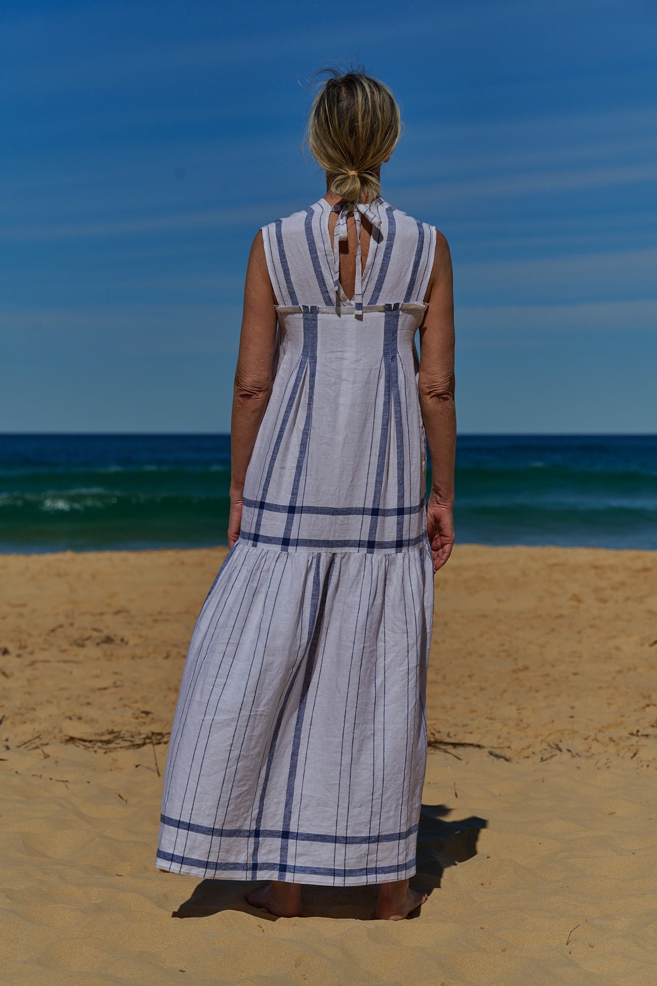 Made from European pure linen in an exclusively designed and woven double plaid, the V Maxi Dress is a tiered sleeveless dress that features subtle pleating and gathering detailing.